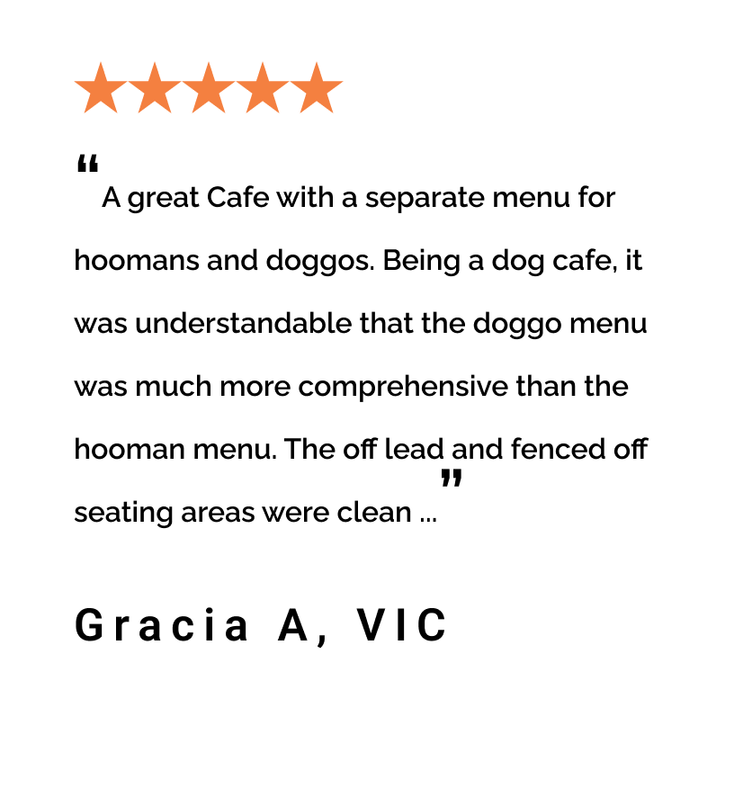 Our menu is designed to appeal to both humans and dogs, with a variety of healthy and delicious choices to pick and enjoy. Our unique doggie menu only use human-grade ingredients, made fresh onsite for our best friends’ nutritional needs.